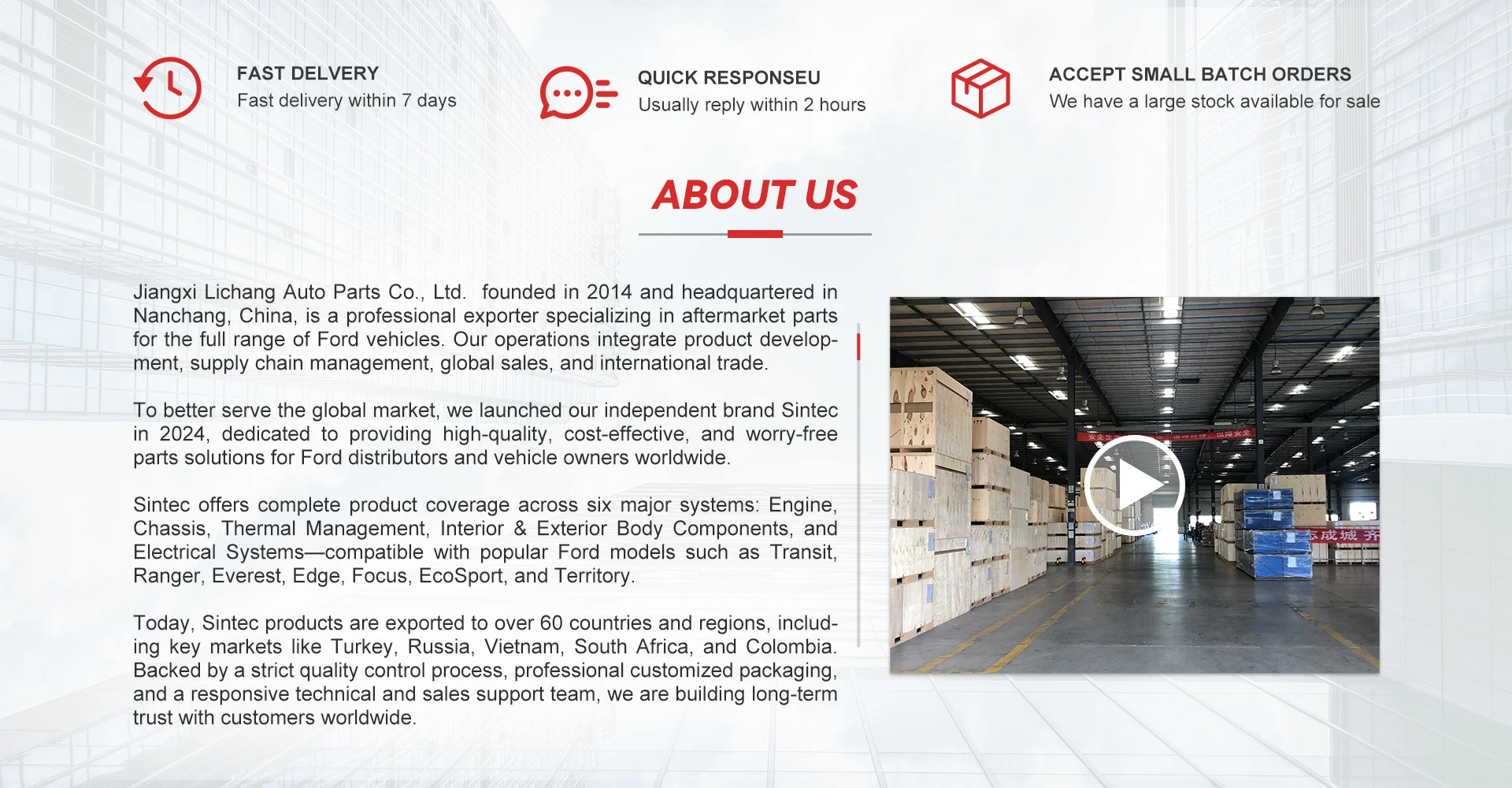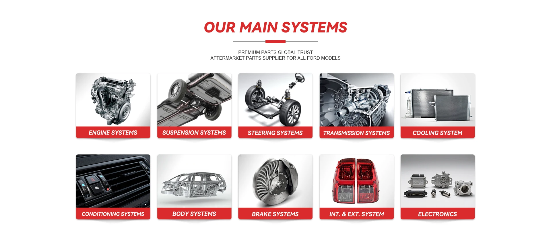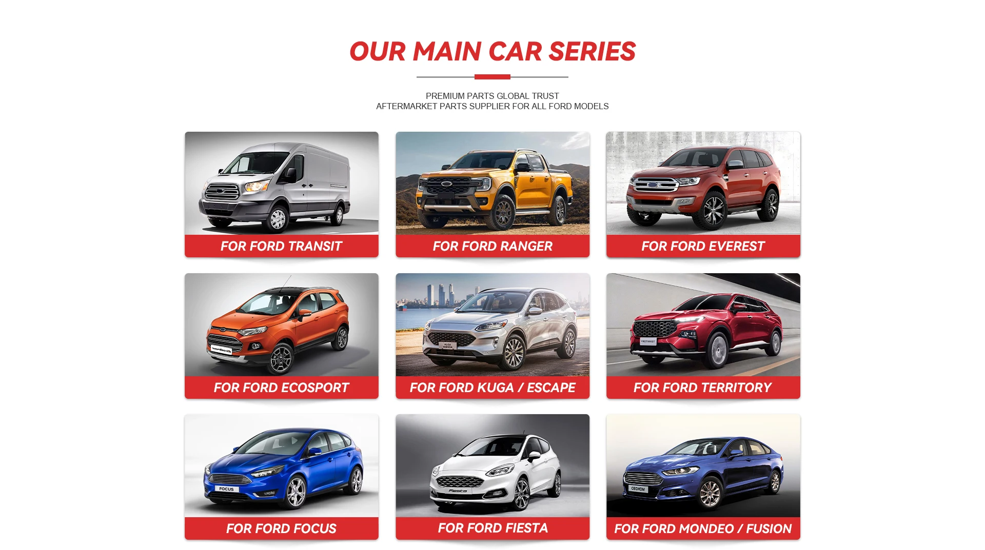 主な製品:フォードトランジット用パーツ、フォードレンジャー用パーツ、フォードエベレスト用パーツ、フォードフォーカス用パーツ、フォードフィエスタ用パーツ